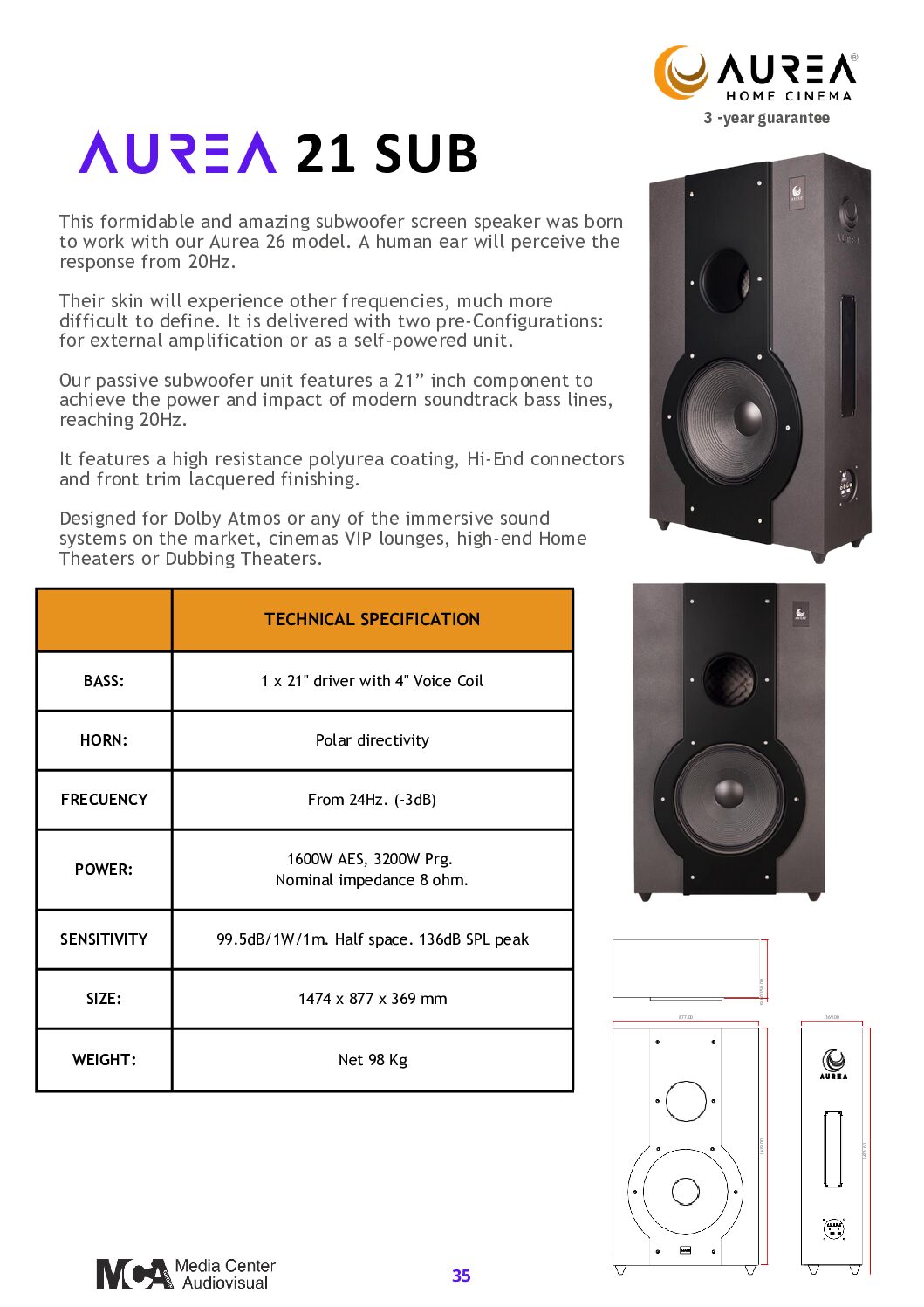 Este formidable y sorprendente subwoofer de pantalla fue diseñado para funcionar con nuestro modelo Aurea 26. El oído humano percibirá la respuesta a partir de los 20 Hz. Su piel experimentará otras frecuencias, mucho más difíciles de definir. Se entrega con dos preconfiguraciones: para amplificación externa o como unidad autoamplificada.